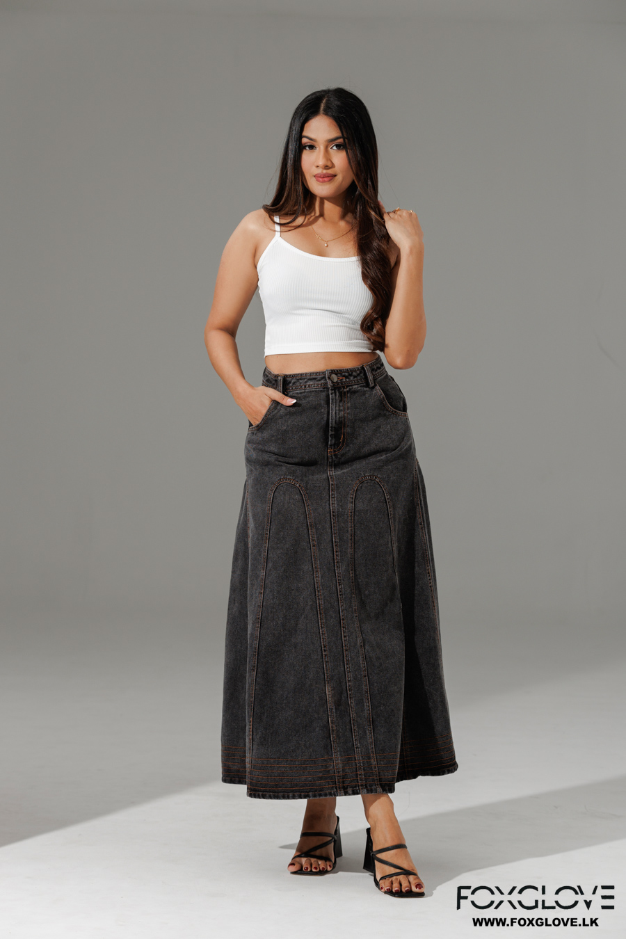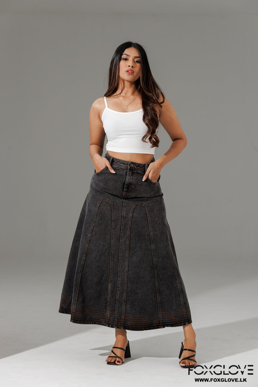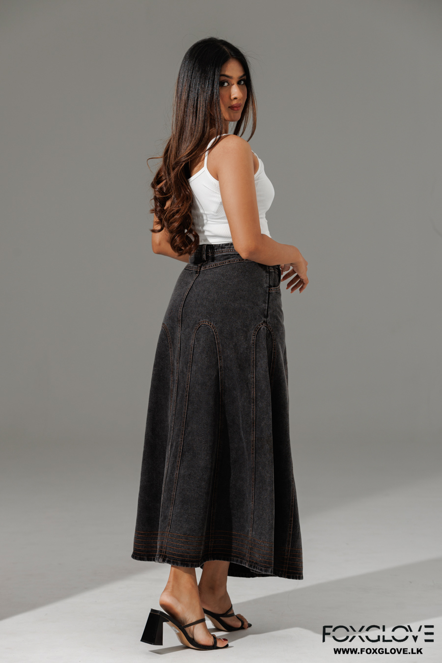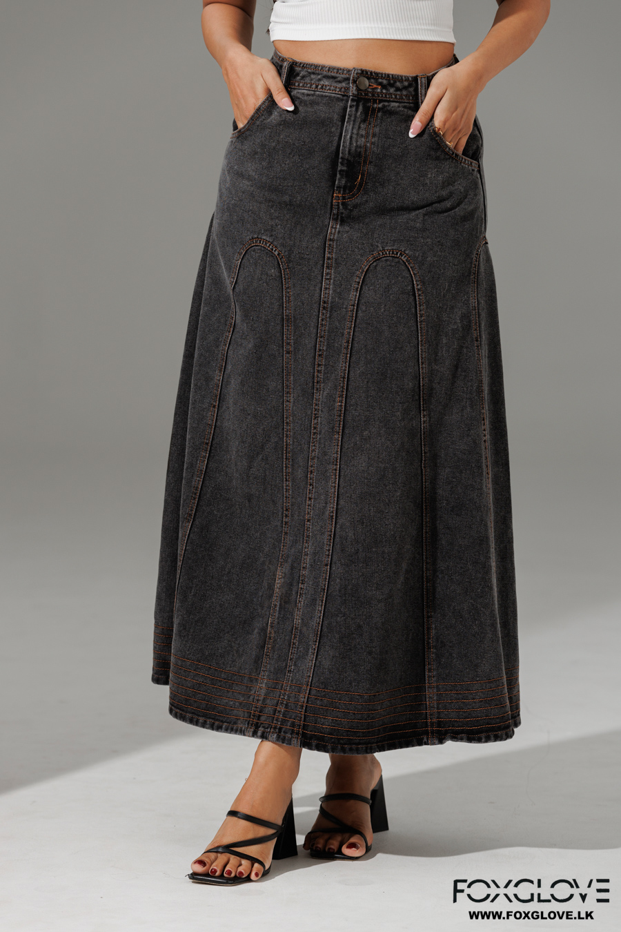 PILCRO BLACK DENIM GODET LONG SKIRT