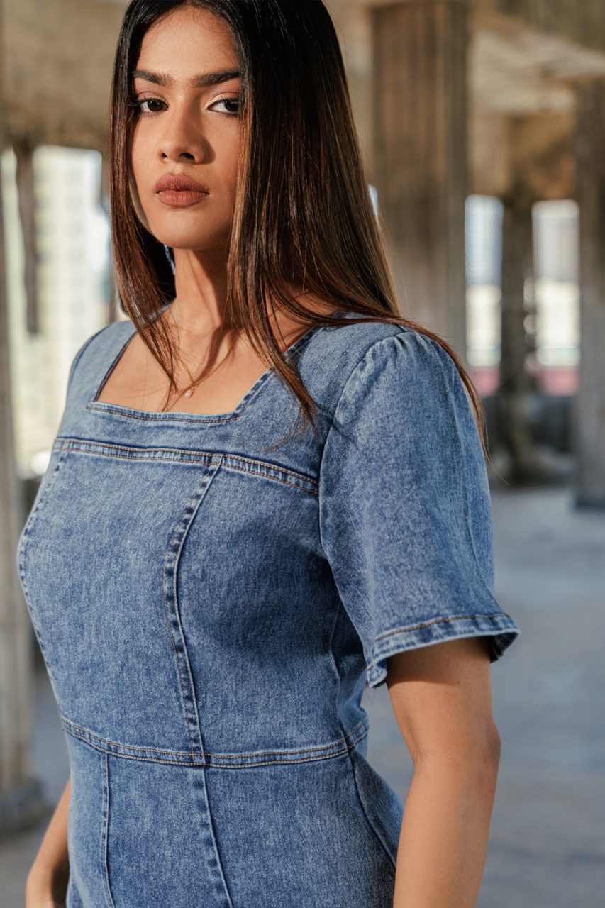 SQUARE NECK DENIM MIDI DRESS